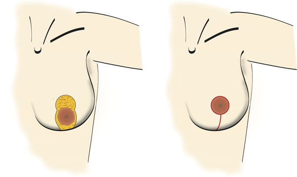 Cette technique ne laisse qu’une cicatrice autour de l'aréole. C’est la rançon cicatricielle minimale pour une mastopexie. Le principal inconvénient de cette technique est l'aplatissement du sein et de l’aréole. Avec le temps, l’aréole s’élargit en un large disque plat. Cette technique ne peut être employée que pour de jeunes patientes avec une peau élastique et une ptose très modérée .